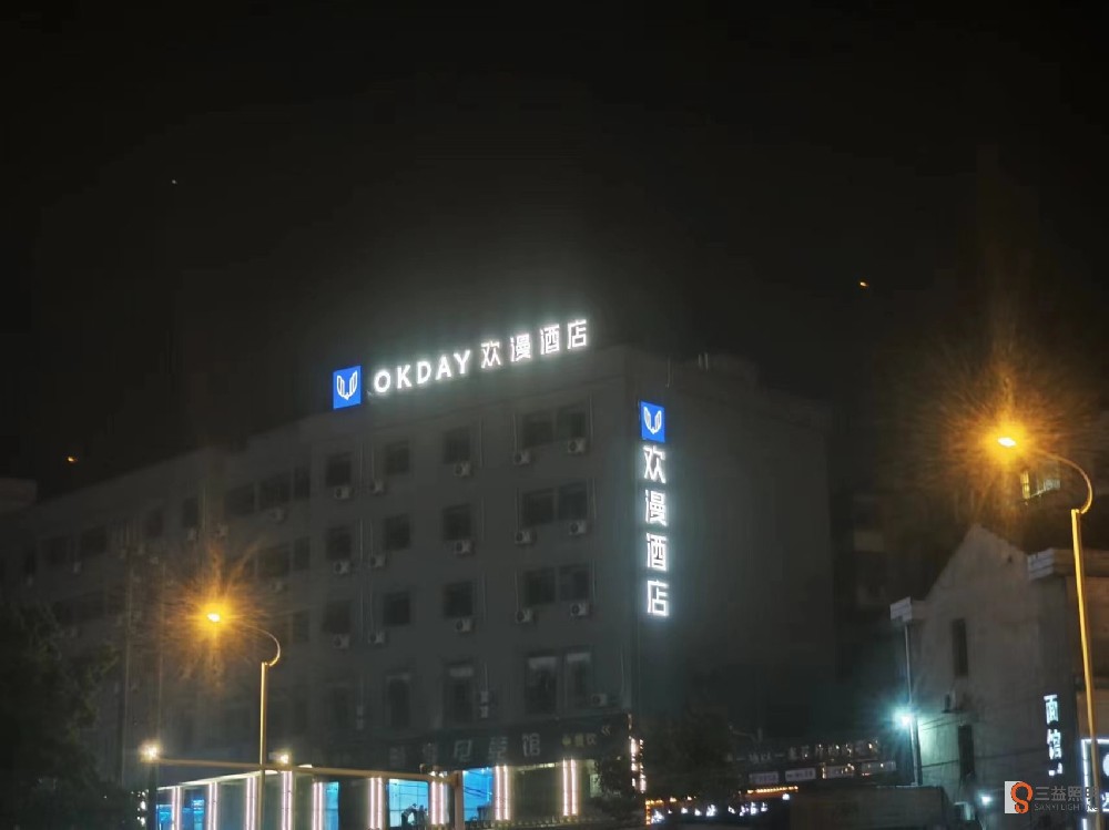 益陽市歡漫酒店外墻發(fā)光字采用不銹鋼制作面殼和底亮,亞克力面板,內(nèi)置藍景光源,熱鍍鋅方通鋼架。