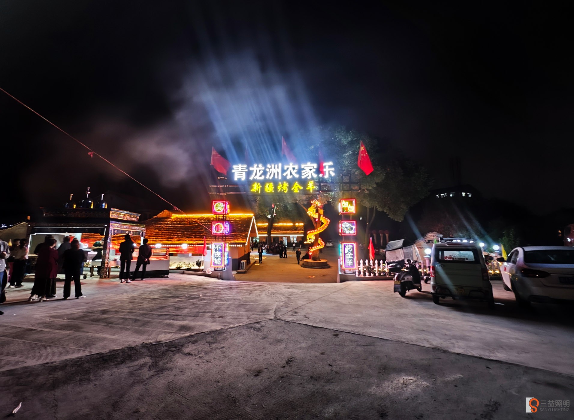 青龍洲農(nóng)家樂,經(jīng)營農(nóng)家菜,新疆燒烤,烤全羊等,經(jīng)過線條燈,洗墻燈,瓦燈,發(fā)光字,網(wǎng)紅門樓等,營造出益陽一處新的網(wǎng)紅打卡地。